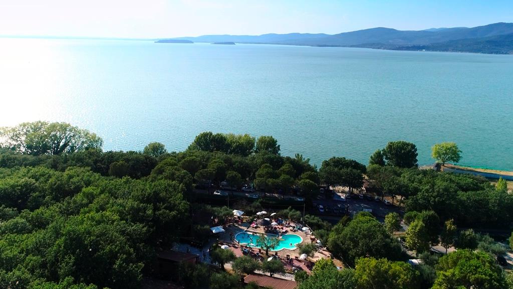 Extra Info: Terrasvormige camping, Stacaravans, chalets en bungalows, Animatie voor de kinderen, Italiaanse les op vakantie, Rust en natuur, Direct aan het Trasimenomeer & inclusief transfers.